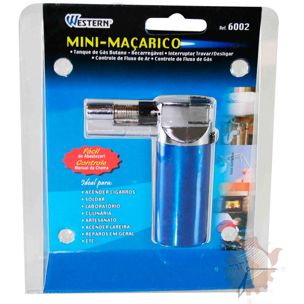 O mini maçarico Western Profissional tem tanque de gás butano recarregável, interruptor travar/ desligar e controle de fluxo de gás.